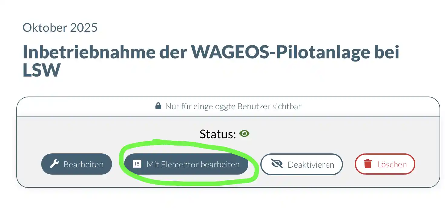 Mit dem Button kann der Inhalt des Beitrags bearbeitet werden. Im Elementor-Bereich können zudem die SEO-Einstellungen vorgenommen werden.